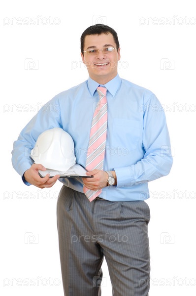 Инженер с белой жесткой шляпой, держащий клипборд, изолированный на белом фоне