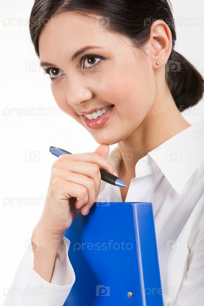 Близкий план красивой сотрудницы с папкой в руке, улыбающейся на белом фоне