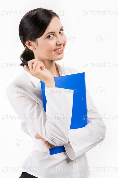 Фото красивой сотрудницы с папкой и ручкой в руке, улыбающейся и смотрящей на камеру