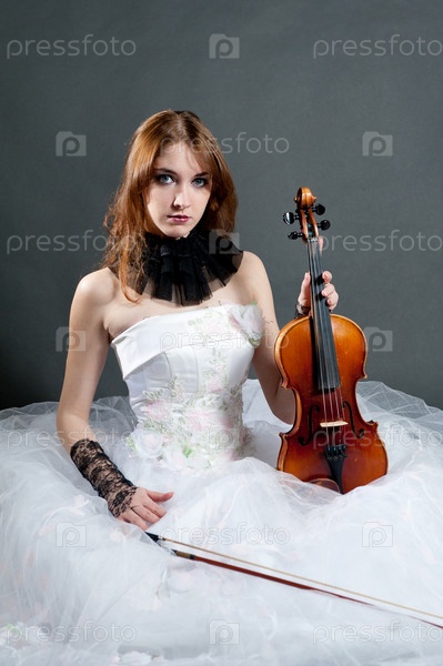Девушка в белом пышном платье со скрипкой на черном фоне