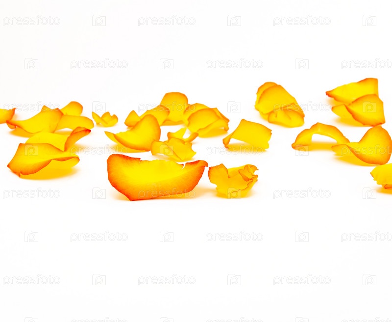 Белый фон украшен лепестками роз желтого и оранжевого цвета