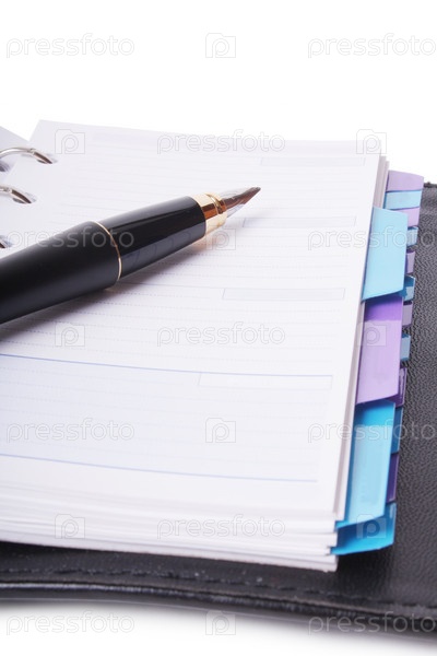 Офисный натюрморт (ручка и планировщик) на белом фоне (изолированный)