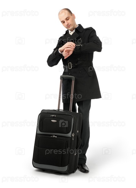 Мужчина с багажом смотрит на часы
