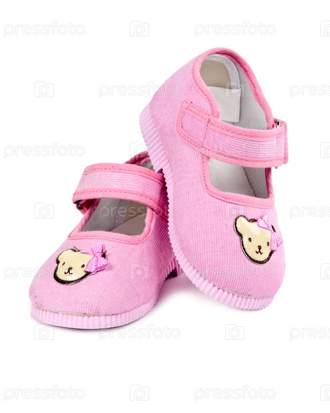 Пара детских розовых туфель на белом фоне