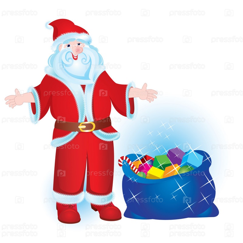 Дед Мороз с мешком подарков, белый фон