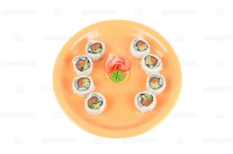 Японские суши на тарелке на белом