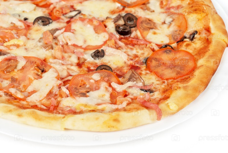 Пицца с ветчиной, помидорами, оливками и сыром моцарелла