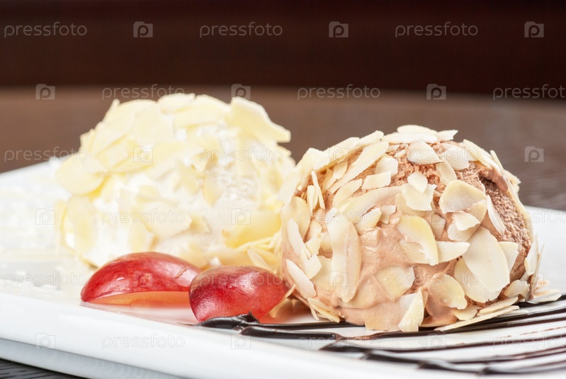 Десерт: мороженое с миндалем, шоколад и виноград
