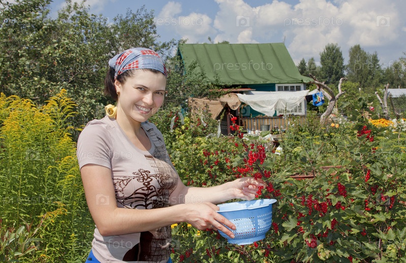 Молодая женщина собирает красную смородину
