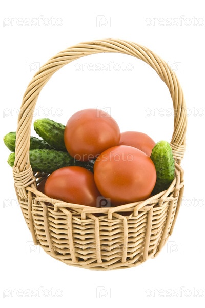 Корзина с огурцами и помидорами на белом фоне