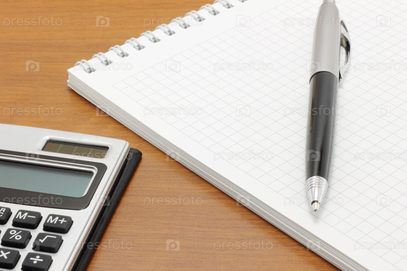 Открытый блокнот с ручкой и калькулятором на столе