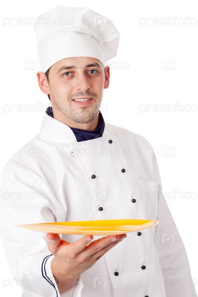 Повар держит тарелку на белом фоне