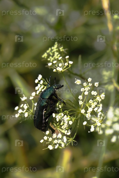 Зеленый жук на белых цветах