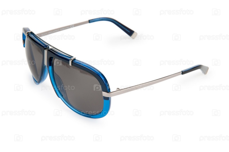 Солнцезащитные очки в синей оправе на белом фоне
