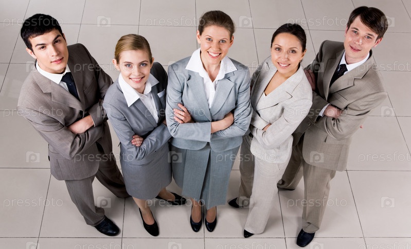 Портрет уверенной бизнес-группы, стоящей на полу и смотрящей в камеру с улыбкой