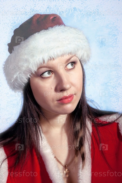 Портрет молодой девушки в шапке Деда Мороза на голубом фоне