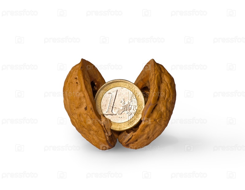 Монета в расколотом орехе на белом фоне