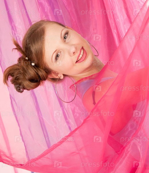 Молодая женщина на фоне розовой органзы
