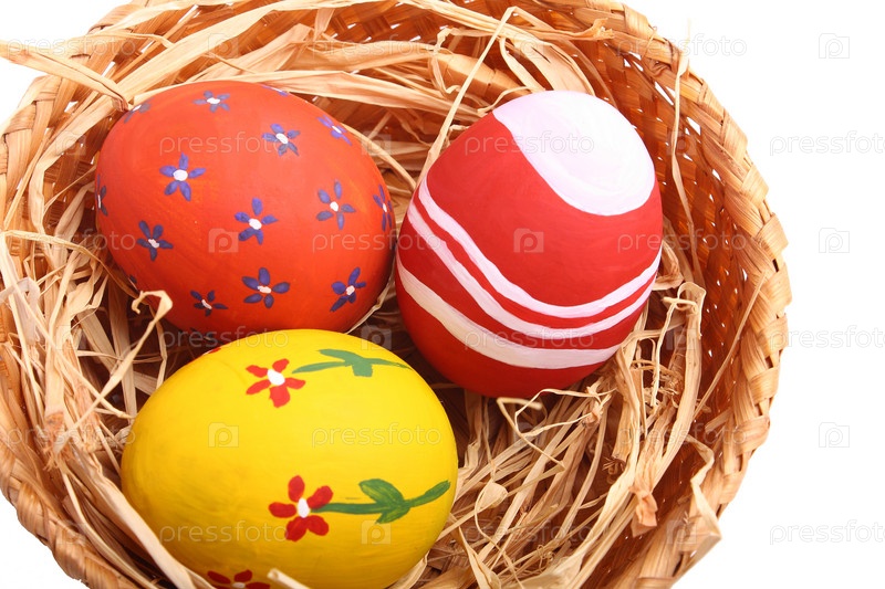 Пасхальные натюрморты: яйца в корзине, украшенные соломой