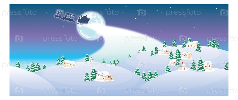 Упряжка оленей Санта-Клауса на фоне луны, домики и елки на горках, иллюстрация
