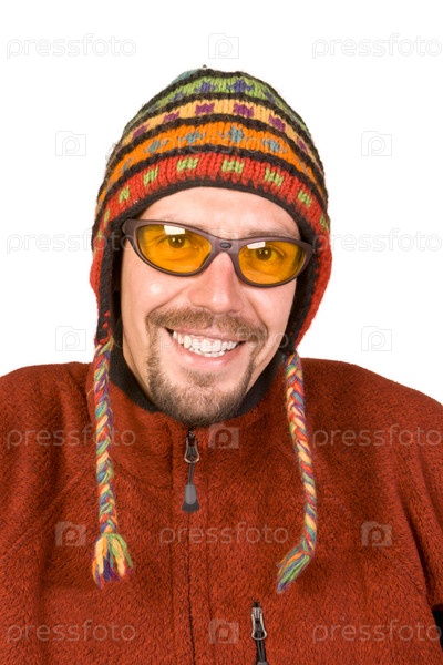 Портрет улыбающегося мужчины в очках и в шапке на белом фоне