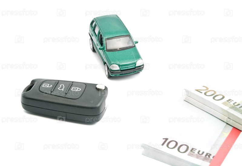 Зеленый автомобиль, клюи от автомобиля и банкноты евро