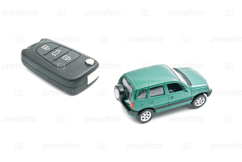 Зеленый автомобиль и ключи от машины с сигнализацией на белом