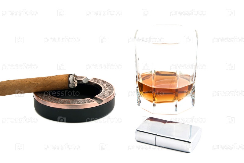 Сигара в металлической пепельнице.ю зажигалка и виски