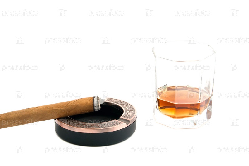 Сигара в пепельнице и виски на белом