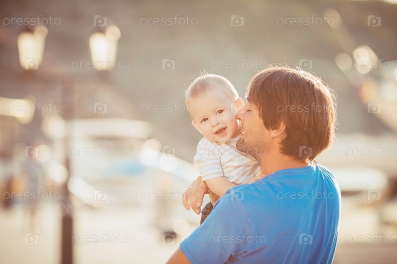 Папа гуляет с сыном у моря