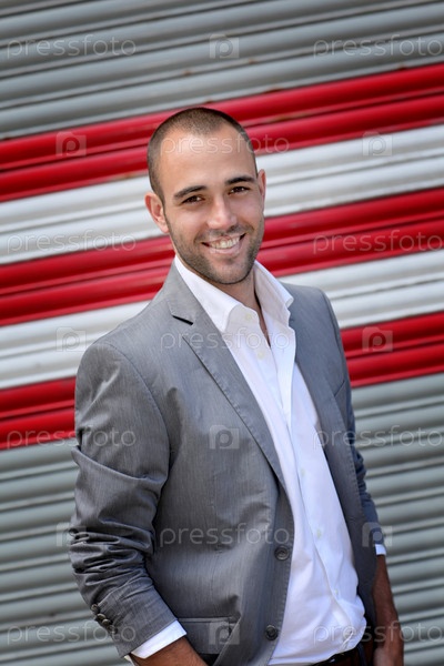 Привлекательный мужчина, стоя на метро полосатый фон
