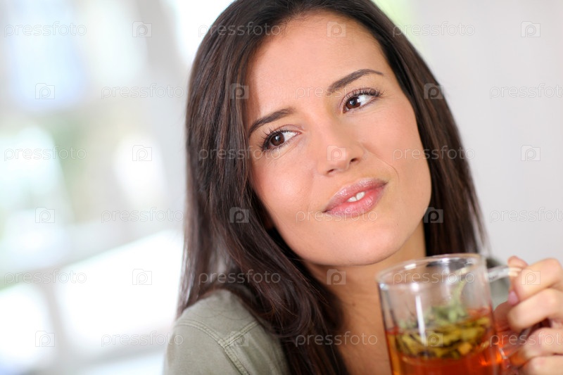 Портрет молодой женщины, пьет травяной настой