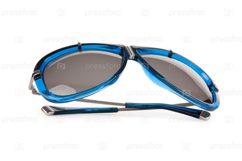 Солнцезащитные очки в синей оправе на белом фоне