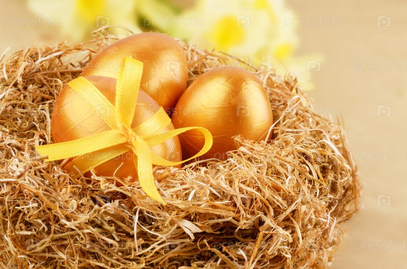 Золотые пасхальные яйца в гнезда на золотом фоне