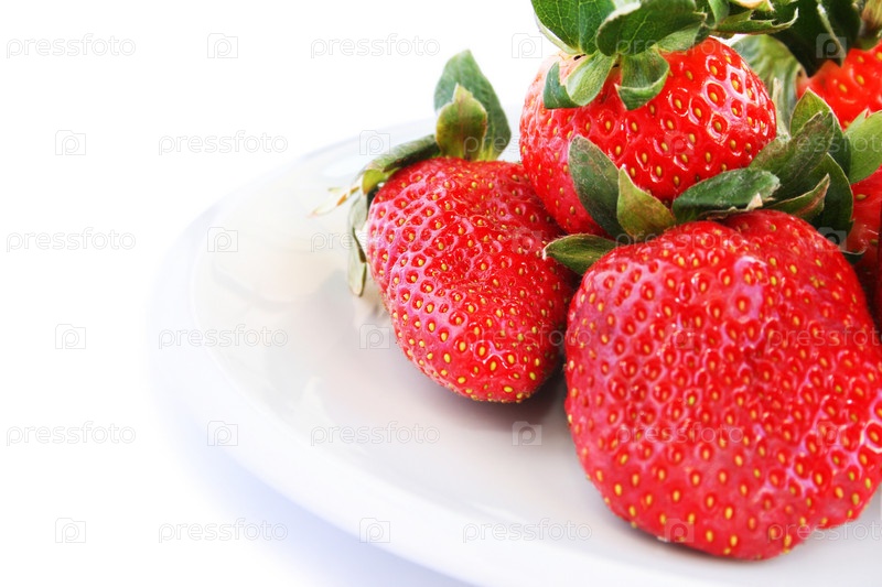 Спелая клубника на тарелке, белый фон