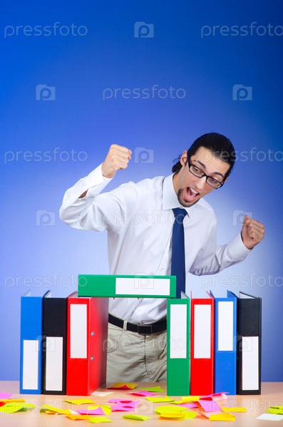Раздраженный бизнесмен со множеством папок и стикеров