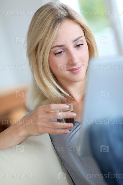 Молодая женщина, использует электронный планшет на диване