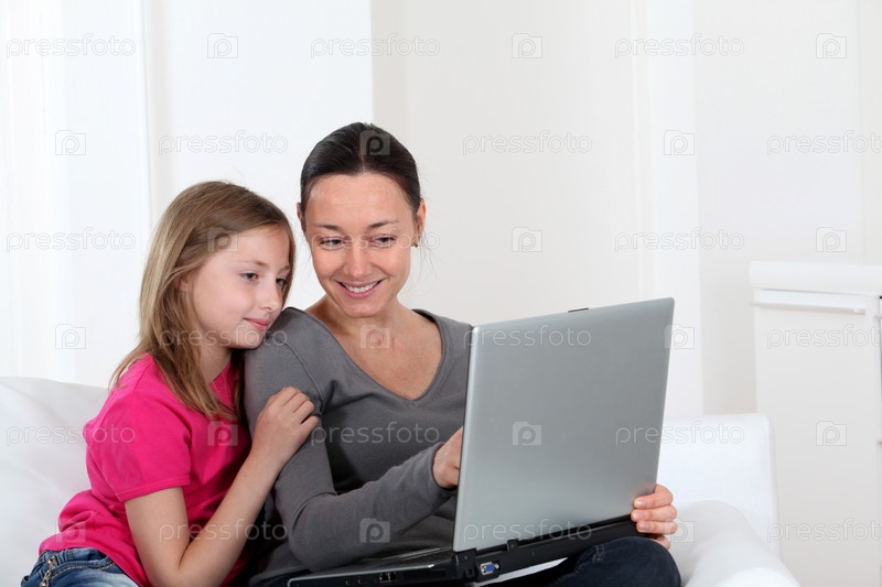Мать и дочь, использует ноутбук у себя дома