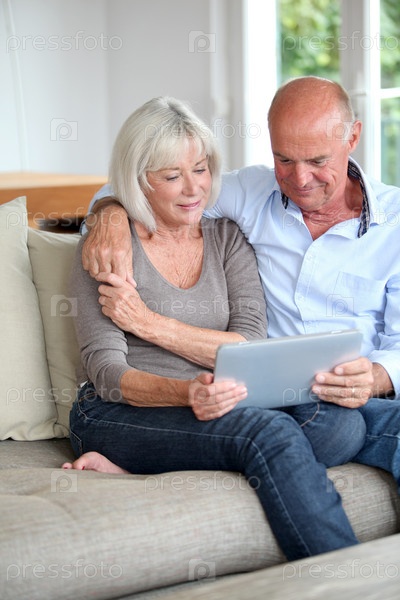 Пожилые супружеские пары, с использованием электронным Планшетом дома