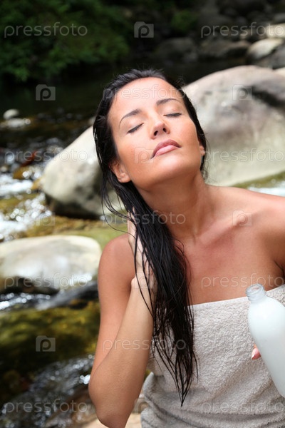 Красивая молодая женщина, применяя ополаскиватель, сидя у реки