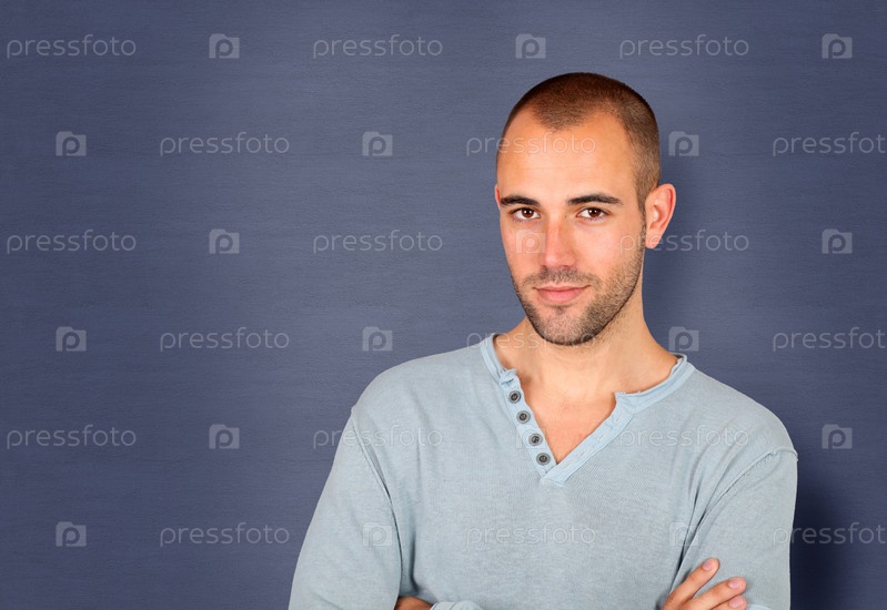 Красивый мужчина, стоя на синем фоне