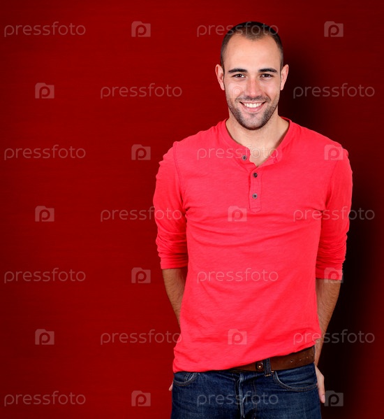 Красивый мужчина, стоя на красном фоне