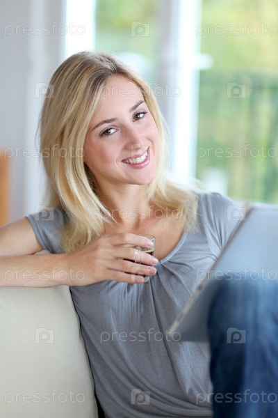 Молодая женщина, используя электронный планшет