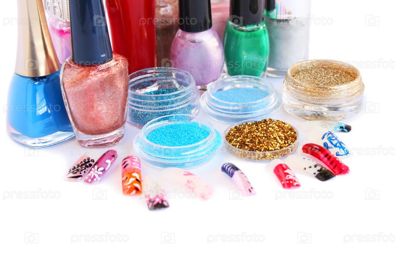 Лаки для ногтей, блестки и накладные ногти на белом фоне