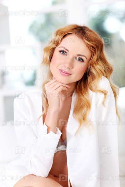 Красивая женщина в белье, сидя на кровати