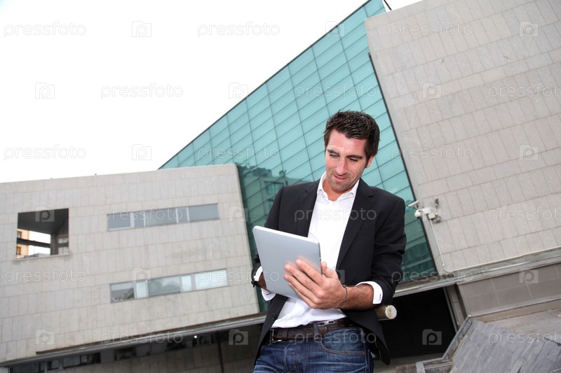 Человек, используя электронный планшет