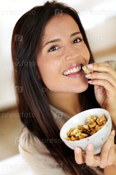 Красивая брюнетка ест кашу по утрам
