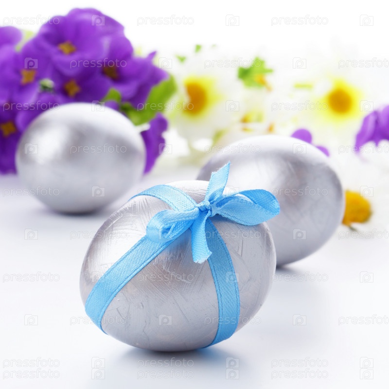 Пасхальные яйца с бантиками на белом фоне
