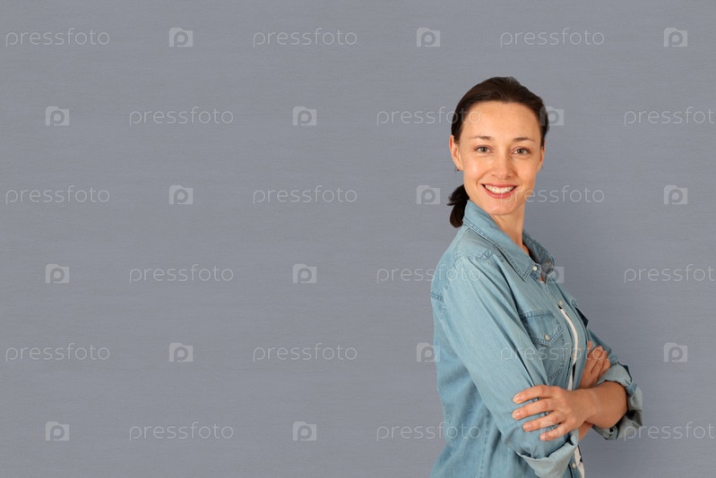 Портрет женщины, стоя на сером фоне