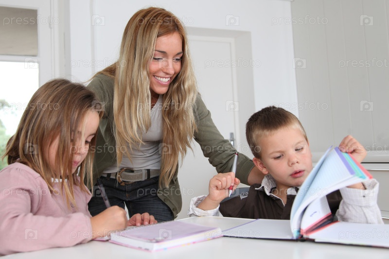 Женщина помогает детям с заданием